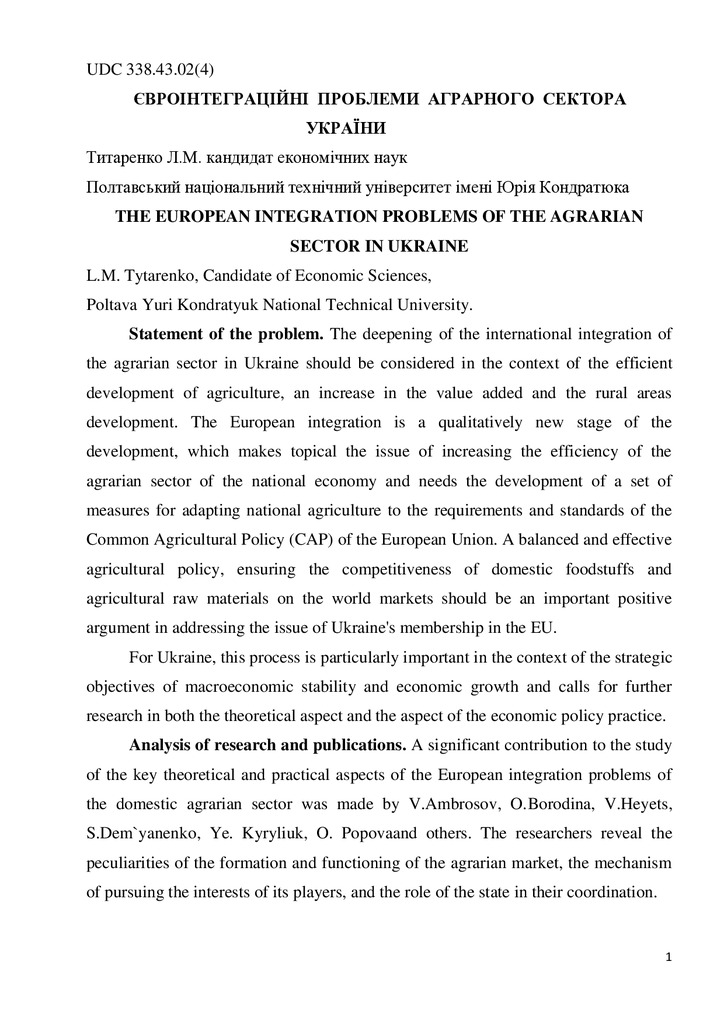 The European integration problems of the agrarian sector in Ukraine