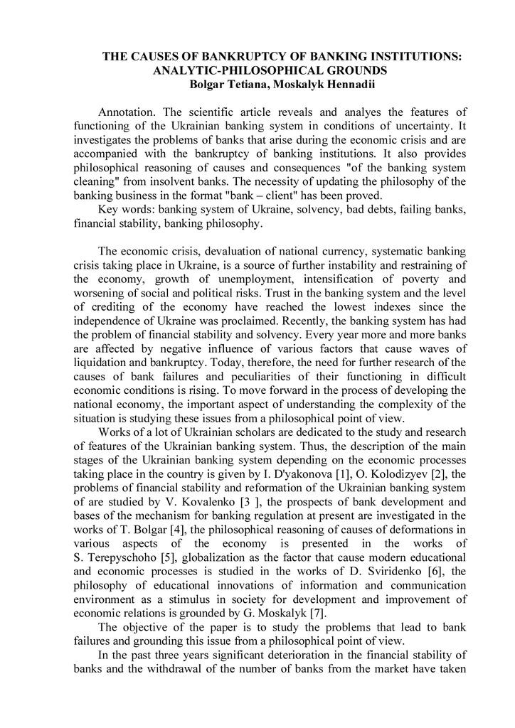The causes of bankruptcy of banking institutions: analytic-philosophical grounds