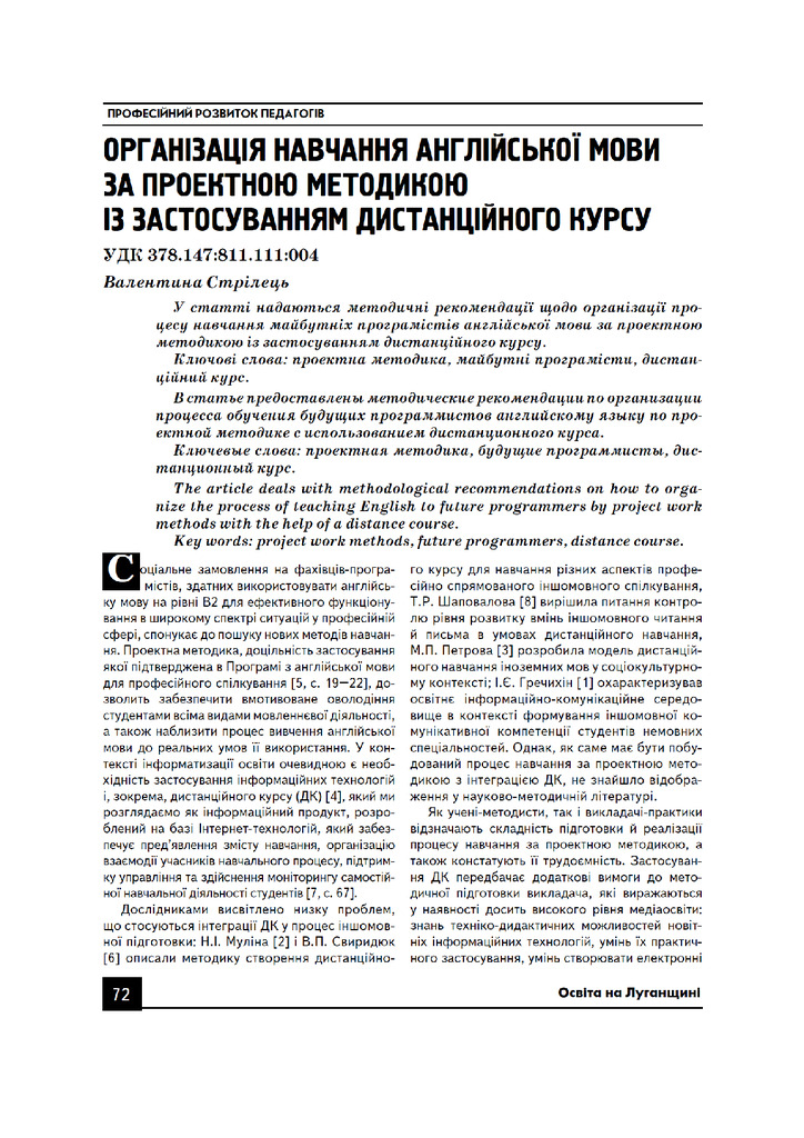 У статті надаються методичні рекомендації щодо організації процесу навчання майбутніх програмістів англійської мови за проектною методикою із застосуванням дистанційного курсу.