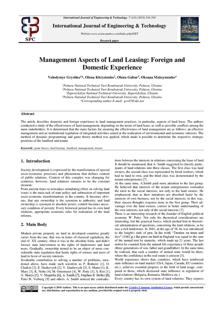 The article describes domestic and foreign experience in land management practices, in particular, aspects of land lease. The authors conducted a study of the effectiveness of land management, depe...