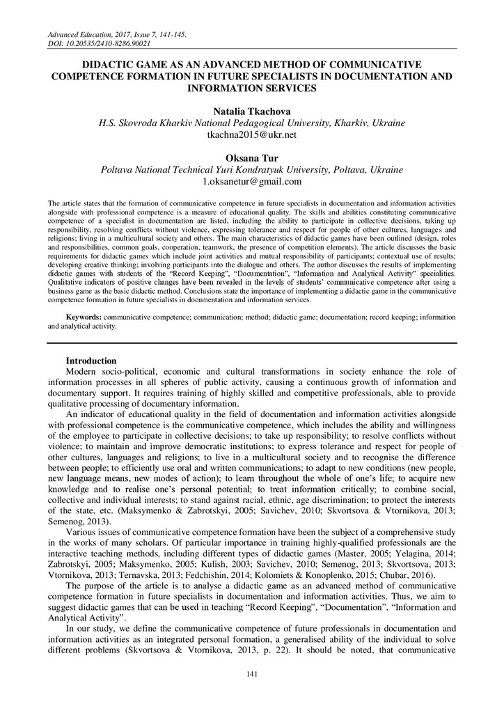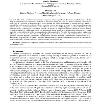 Didactic game as the advanced method of forming communicative competence of future specialists in documentation and information services