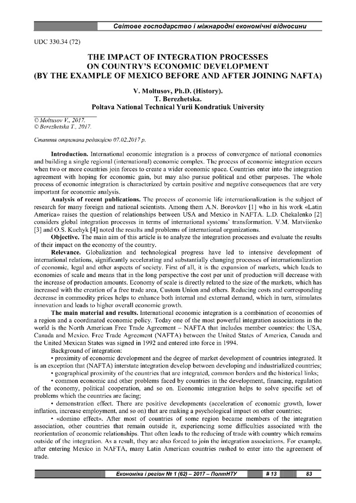 Стаття 2018/11/13The impact of integration processes on country’s economic development (By the example of Mexico before and after joining NAFTA)