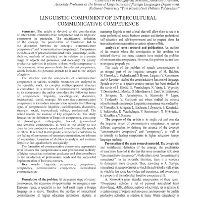 The article is devoted to the consideration of intercultural communicative competence and its linguistic component in particular. The multifaceted definition of the concept, the peculiarities of t...