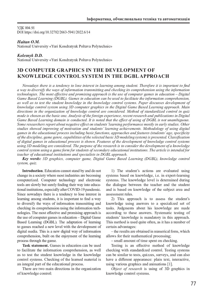 Use of 3D computer graphics in the development of knowledge control system in the DGBL approach