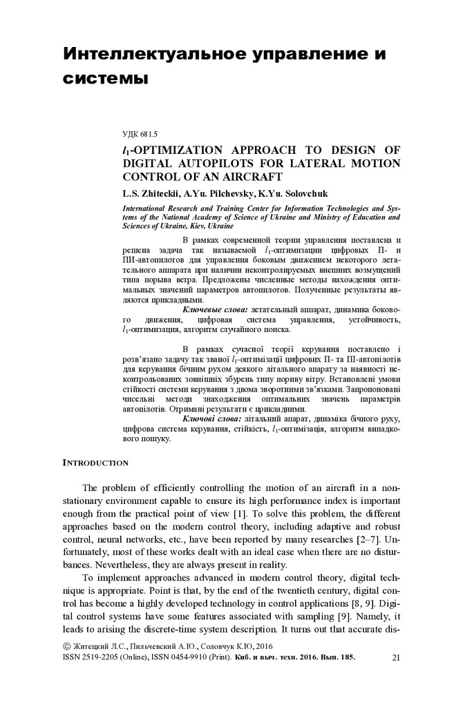 В рамках сучасної теорії керування поставлено і розв’язано задачу так званої l1-оптимізації цифрових П- та ПІ-автопілотів для керування бічним рухом деякого літального апарату за наявності неконтро...