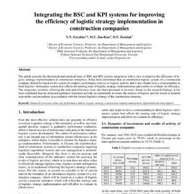 The article presents the theoretical and practical basis of BSC and KPI systems integration with a view to improve the efficiency of logistic strategy implementation at construction enterprises. It...