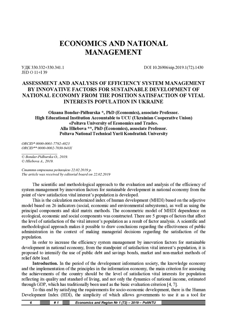 Assessment and analysis of efficiency system management by innovative factors for sustainable development of national economy from the position satisfaction of vital interests population in Ukraine