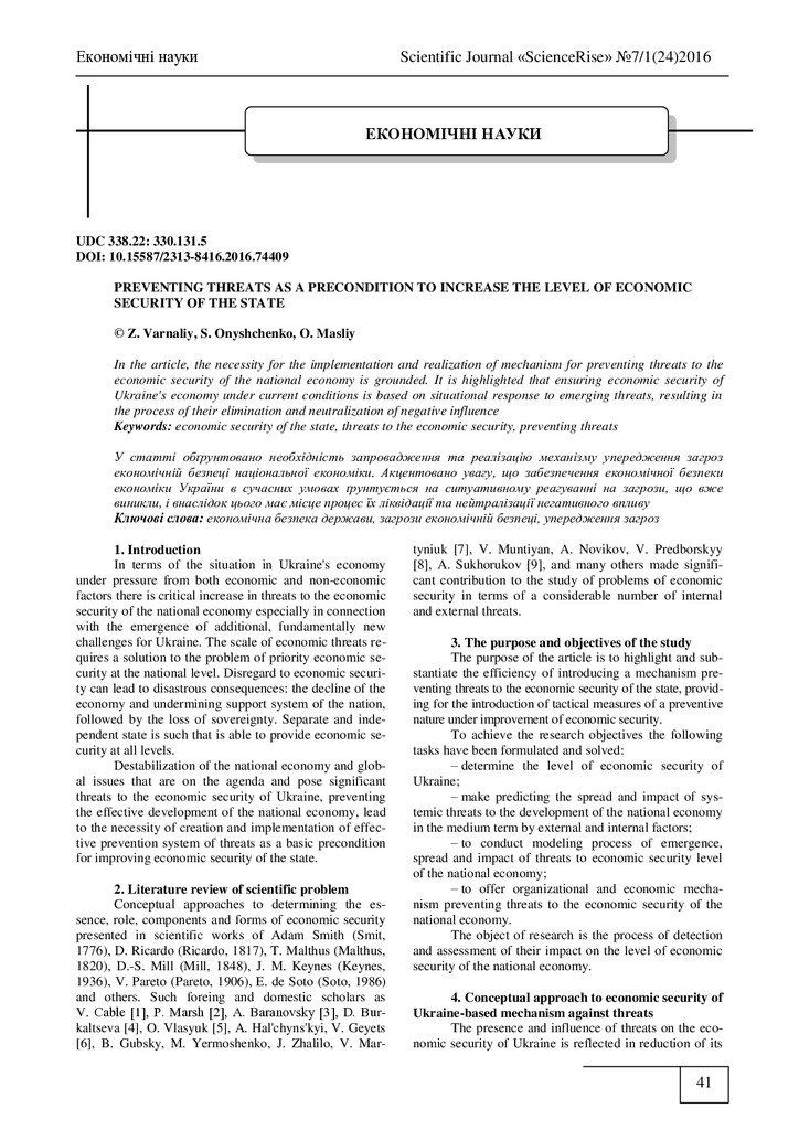 Стаття 2018/07/09Preventing threats as a precondition to increase the level of economic security of the state