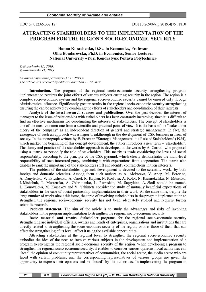 The article defines the essence of the concept of “stakeholders in the program of strengthening the socio-economic security of the region”. The benefits and risks of attracting stakeholders to meet...