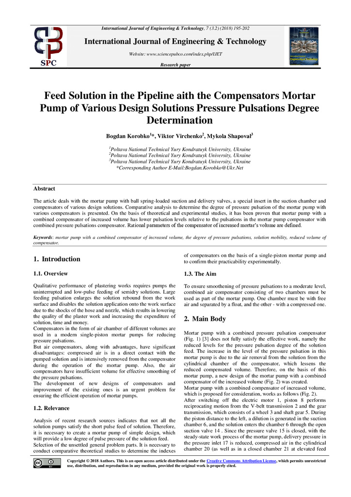 The article deals with the mortar pump with ball spring-loaded suction and delivery valves, a special insert in the suction chamber and compensators of various design solutions. Comparative analysi...