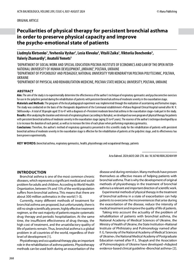 The aim of the study is to experimentally determine the effectiveness of the author’s technique of respiratory gymnastics and psychocorrective exercises for use in the polyclinic period during the ...