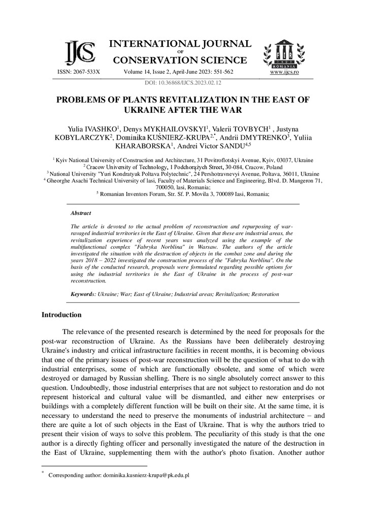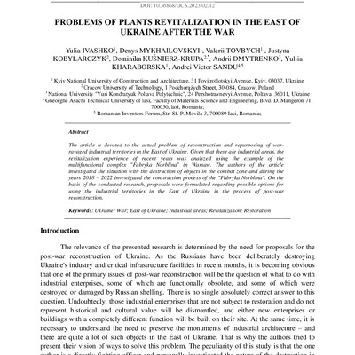 The article is devoted to the actual problem of reconstruction and repurposing of warravaged industrial territories in the East of Ukraine. Given that these are industrial areas, the revitalization...