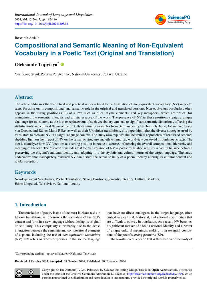 The article addresses the theoretical and practical issues related to the translation of non-equivalent vocabulary (NV) in poetic texts, focusing on its compositional and semantic role in the origi...