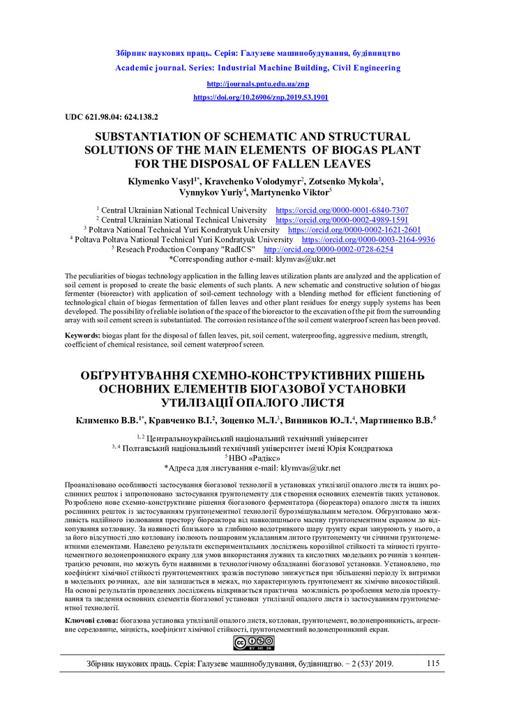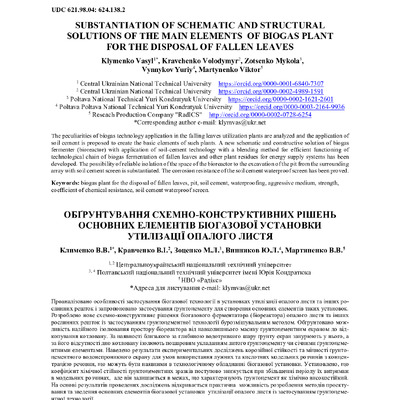 Стаття 2022/07/10Substantiation of schematic and structural solutions of the main elements of biogas plant for the disposal of fallen leaves