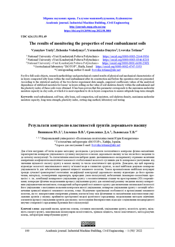 Стаття 2024/10/14The results of monitoring the properties of road embankment soils