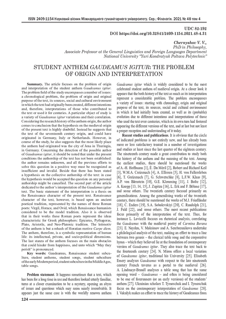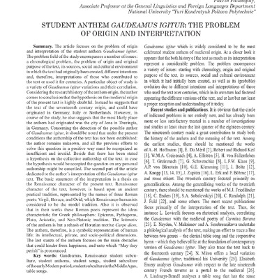 The article focuses on the problem of origin and interpretation of the student anthem Gaudeamus igitur. The problem field of the study encompasses a number of issues: a chronological problem, the ...