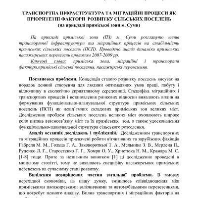 Стаття 2016/07/13Транспортна інфраструктура та міграційні процеси як пріоритетні фактори розвитку сільських поселень (на прикладі приміської зони м. Суми)