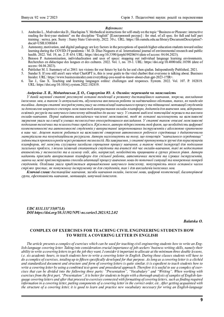 Complex of exercises for teaching civil engineering students how to write a covering letter in english