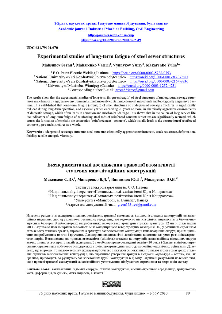 Наведено результати експериментальних досліджень тривалої втомленості (міцності) сталевих конструкцій каналізаційних підземних споруд у хімічно-агресивному середовищі, які одночасно містять хімічні...