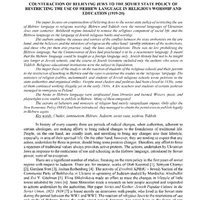 The paper focuses on counteraction o f believing Jews to the soviet state policy of restricting the use o f Hebrew language in religious worship.