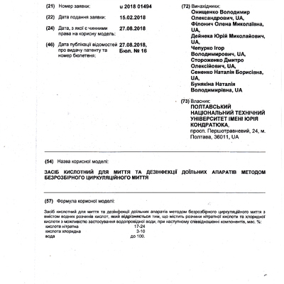 Патент № 127785 на корисну модель. Засіб кислотний для миття та дезінфекції доїльних апаратів методом безрозбірного циркуляційного миття