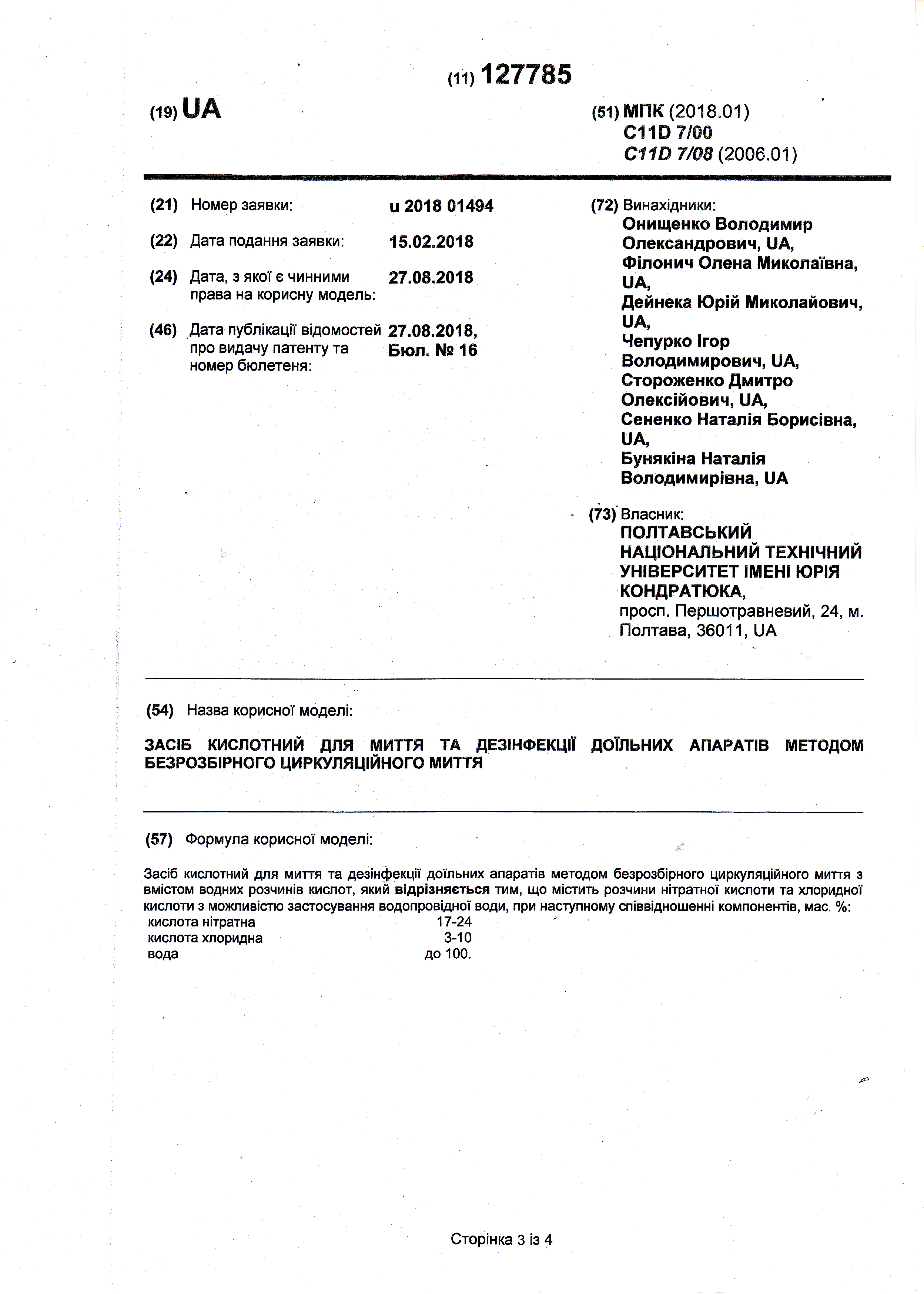 Патент № 127785 на корисну модель. Засіб кислотний для миття та дезінфекції доїльних апаратів методом безрозбірного циркуляційного миття