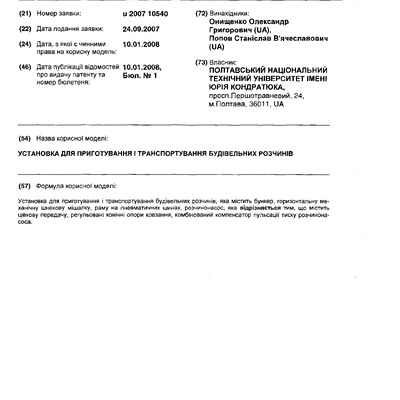 Установка для приготування і транспортування будівельних розчинів, яка складається з бункера, горизонтальної механічної шнекової мішалки, рами на п...